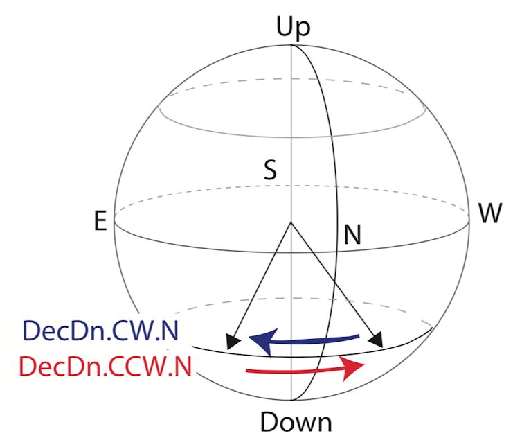 Çalışma katılımcıları, kuzeye bakan deney odasına otururken aşağı doğru işaret eden alan saat yönünde (mavi ok) kuzeybatıdan kuzeydoğuya, saat yönünün tersinde (kırmızı ok) kuzeydoğusundan kuzeybatıya döndü. Manyetik Alan Laboratuvarı, Caltech, CC BY-ND Deney odamızda, manyetik alanı beyne göre sessizce hareket ettirebiliriz, ancak beyin kafayı hareket ettirmek için herhangi bir sinyal başlatmamış olabilir. Bu, başınızın veya bagajınızın bir başkası tarafından pasif olarak döndürüldüğü veya dönen bir araçta bir yolcu olduğunuz durumlarla karşılaştırılabilir. Yine de, bu durumlarda, bedeniniz manyetik alan değişimleriyle birlikte uzaydaki konumu ile ilgili vestibüler sinyalleri kaydedecektir - bunun aksine, deneysel stimülasyonumuz yalnızca manyetik alan kaymasıydı. Odadaki manyetik alanı değiştirdiğimizde, katılımcılarımız açık bir his yaşamamışlardır.